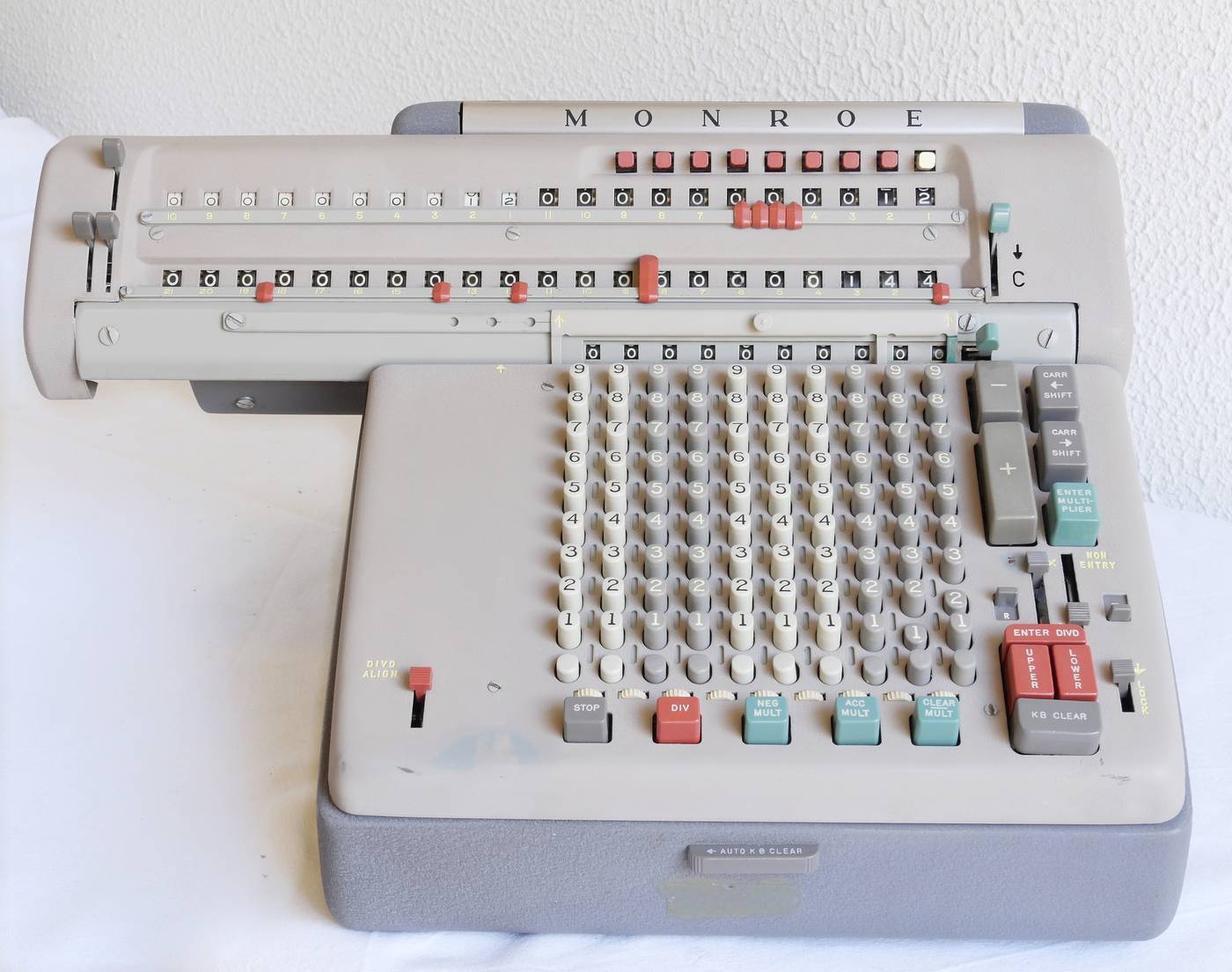 The Monroe 8N-213 is a very luxury machine, equipped with many functions easing particular kinds of calculations. There is a sophisticated back-transfer mechanism from result register to multiplier register, the upper register (counter) consists of two parts which can be cleared separately, the multiplier register can be set to multiply with a constant, etc. To efficiently use these and other functions required a skilled operator. Some help existed in the form of publications like: Machine Methods for Civil Engineering Calculations and Some shortcut’ Statistical Methods by Monroe. For links to both documents see the Assets Page).