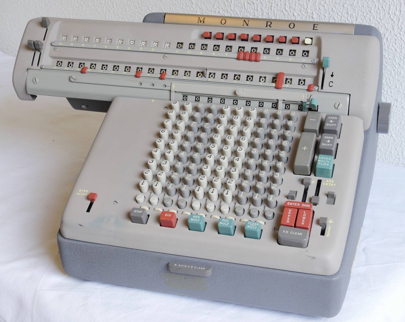The Monroe 8N-213 is a very luxury machine, equipped with many functions easing particular kinds of calculations. There is a sophisticated back-transfer mechanism from result register to multiplier register, the upper register (counter) consists of two parts which can be cleared separately, the multiplier register can be set to multiply with a constant, etc. To efficiently use these and other functions required a skilled operator. Some help existed in the form of publications like: Machine Methods for Civil Engineering Calculations and Some shortcut’ Statistical Methods by Monroe. For links to both documents see the Assets Page).